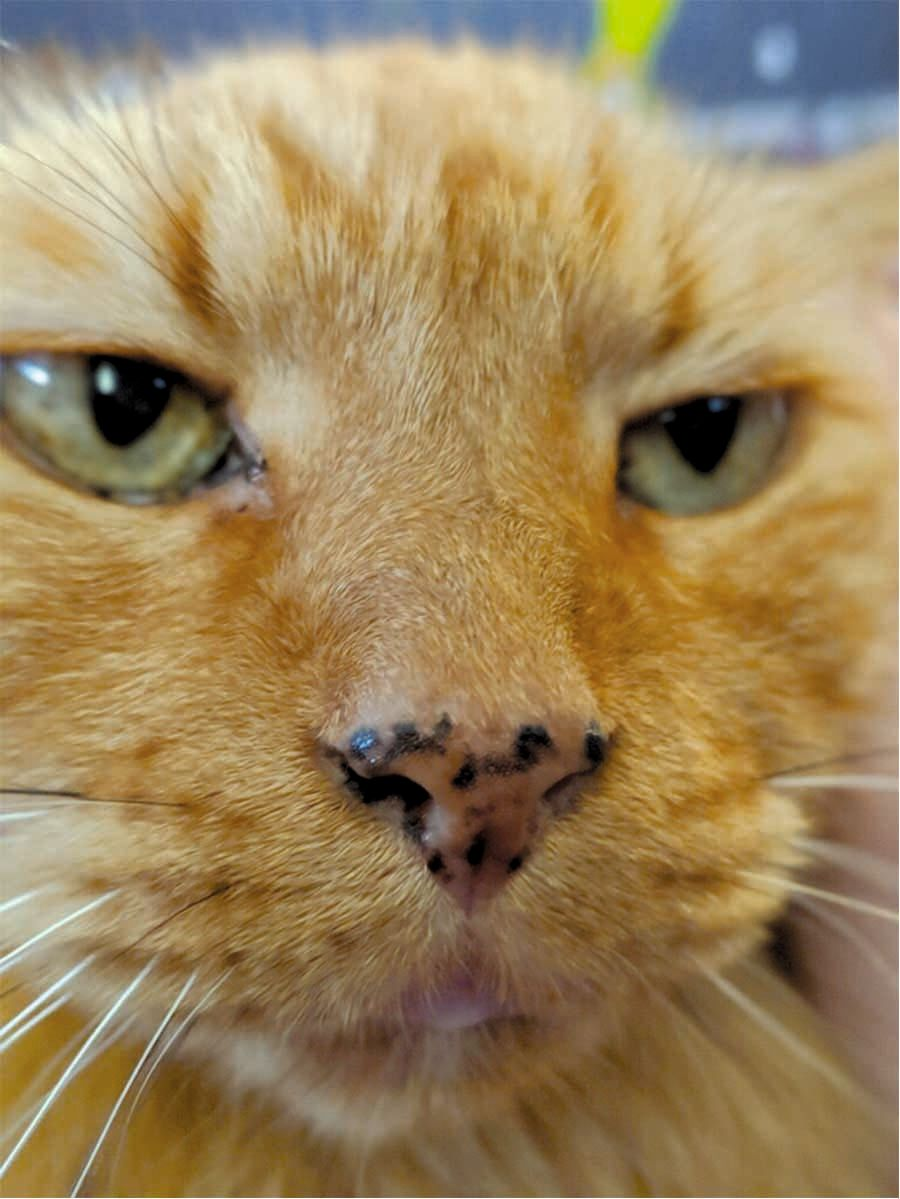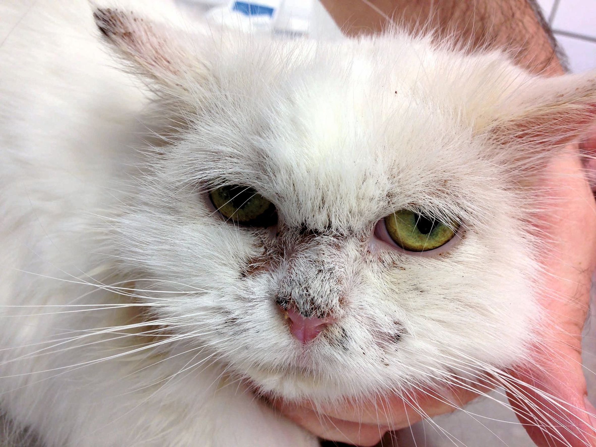 Persistent ulcerative to necrotising lesions develop on the face most typically the nose. Chin and lip lesions are common in cats with flea bite hypersensitivity.